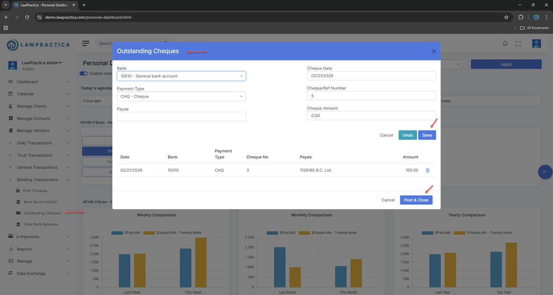 The Outstanding Cheques feature provides a clear, compliant view of all cheques issued but not yet cleared by the bank. With support for trust and general accounts, cheque tracking, stale‑date monitoring, and reconciliation integration, it ensures accurate financial management and full audit readiness across the firm.