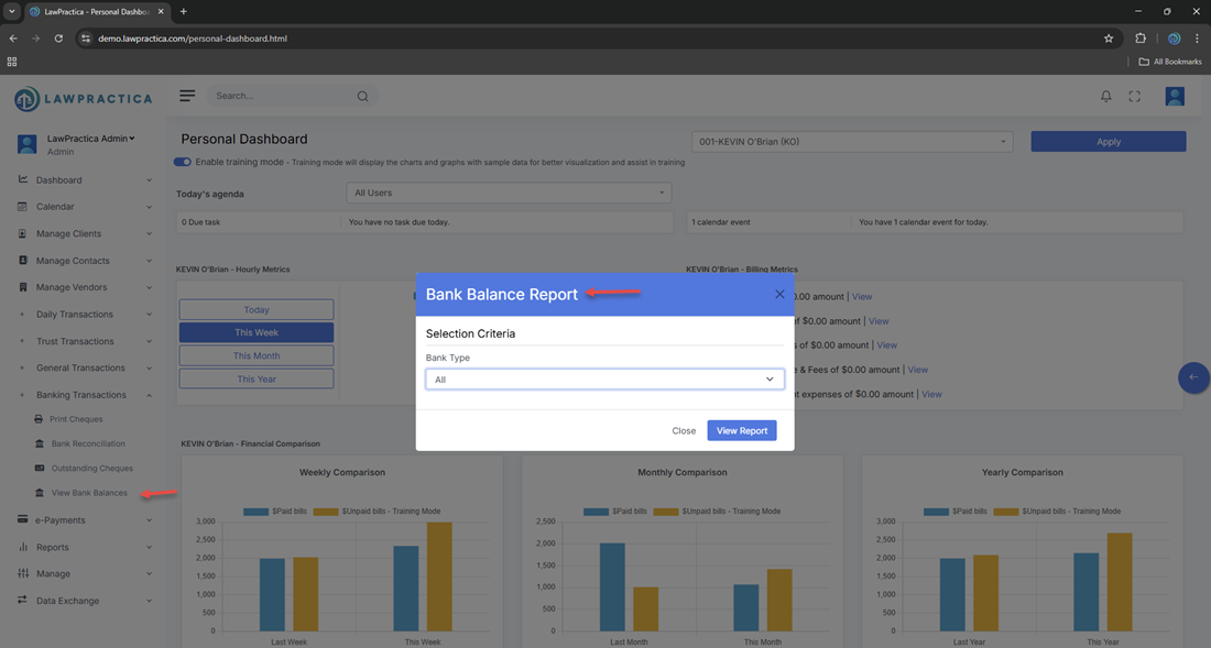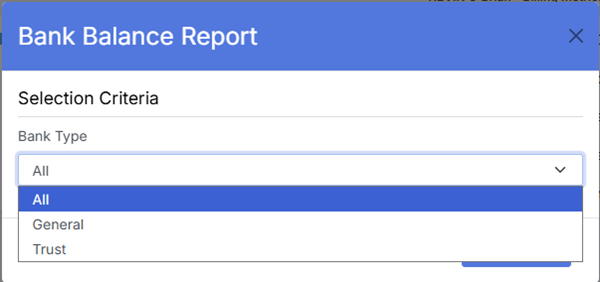The View Bank Balance feature provides a quick, accurate snapshot of the firm’s current bank balances across all configured bank accounts. This includes both: