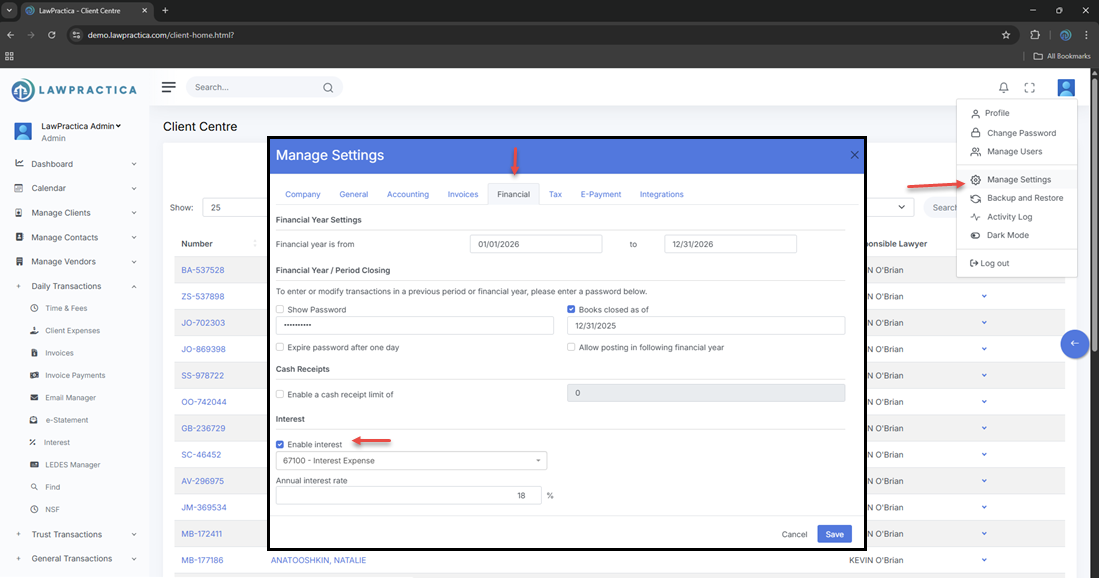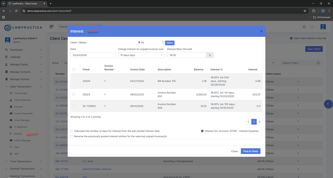The Interest feature allows law firms to calculate and apply interest charges on overdue client invoices. Users can review outstanding balances, apply interest rules, generate interest amounts, and post the resulting charges to the client’s account.