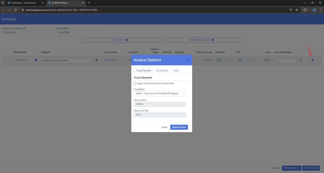 You may also apply Trust Payment when invoicing, review tax settings, and add notes to show on the invoice automatically.