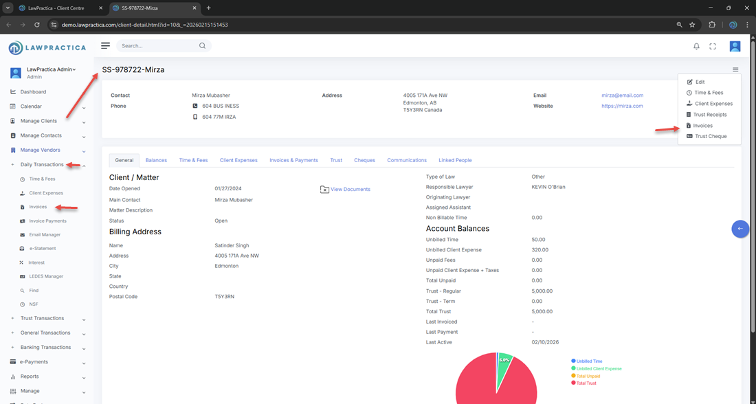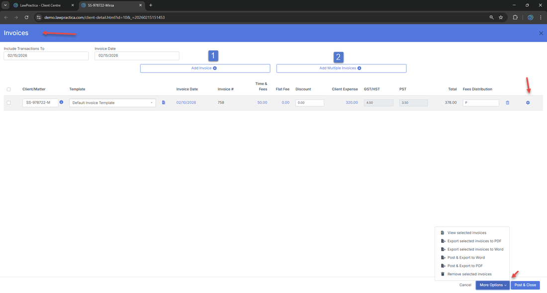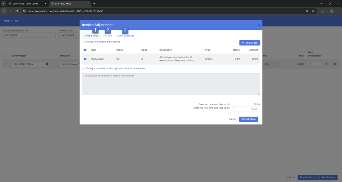The Client Invoice feature allows users to prepare and finalize invoices for a client or matter. Users can include time entries, flat fees, discounts, and client expenses, apply taxes, and generate a final invoice total before posting.