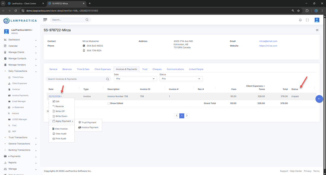 Through Manage Clients > Client Centre > Client Details, you can reverse, write off, or write down the invoice. You can also apply a payment and view the invoice along with the audit.