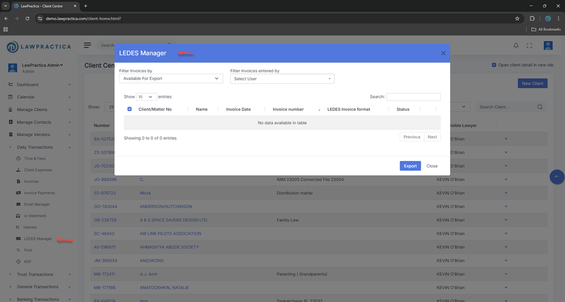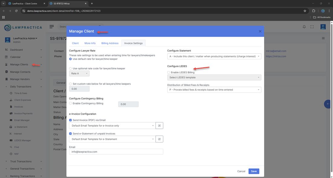 Once enabled, all invoices generated for this client will be eligible for LEDES export through LEDES Manager.