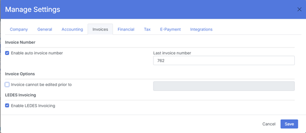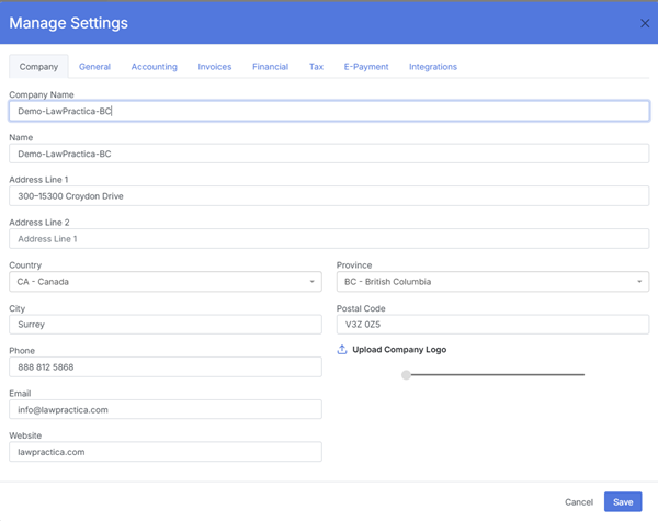 The Manage Settings modal is accessible only to Admin or Owner accounts. It centralizes all firm‑wide configuration options that control how LawPractica behaves across: