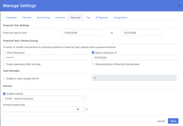 These settings influence billing calculations, interest, and financial reporting.