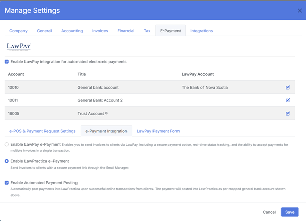 | e‑Payment | LawPay & online payment settings |