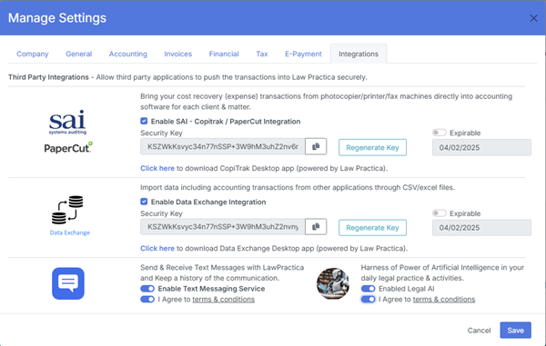 These settings allow LawPractica to connect with external tools for document management, email delivery, accounting, and automation.