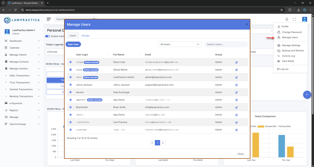 The Manage Users module allows firm administrators and owners to control:
