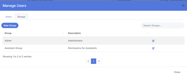 The Groups tab allows administrators to create and manage permission groups. Groups define what users can see and do across the system.