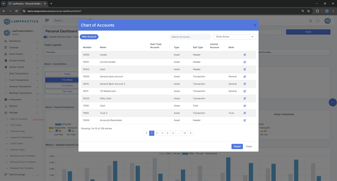 The Chart of Accounts section provides a structured, centralized way to manage all general ledger accounts used across LawPractica. With tools for viewing, creating, editing, and maintaining account details, it ensures accurate financial posting, reporting, and compliance with accounting standards.
