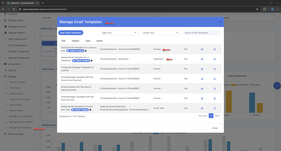 The Manage Email Templates feature allows firms to create, customize, and maintain standardized email templates used throughout LawPractica. These templates ensure: