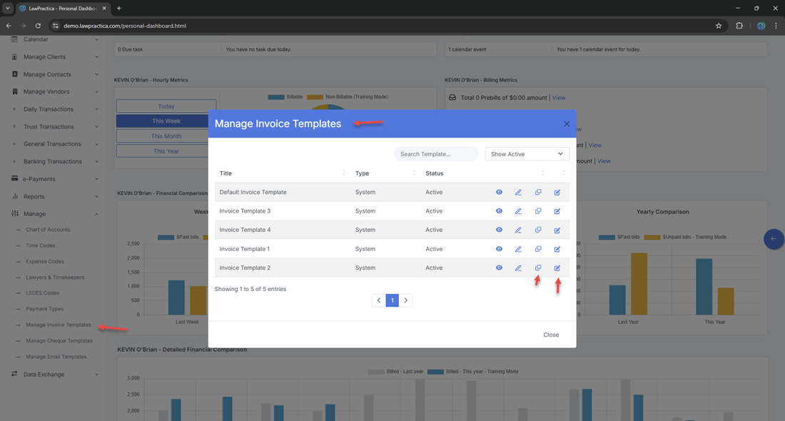 The Manage Invoice Templates feature allows firms to create, customize, and maintain the invoice formats used throughout LawPractica. This includes: