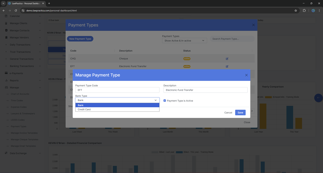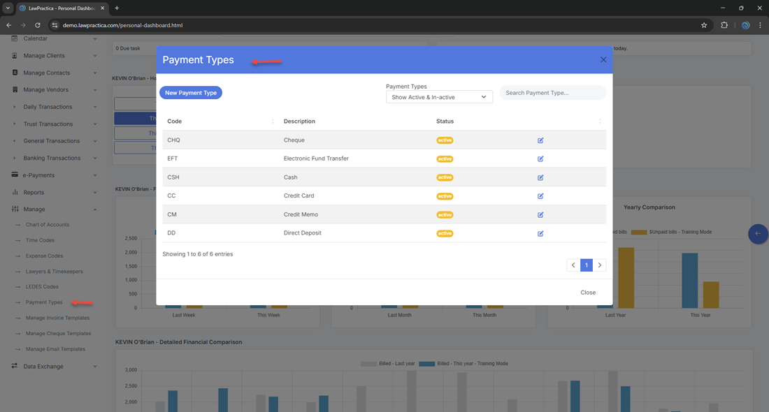 The Manage Payment Types feature provides a structured, centralized way to manage all payment methods used across LawPractica. With tools for viewing, creating, editing, and maintaining payment type details, it ensures consistent payment posting, accurate financial reporting, and standardized terminology across the firm.