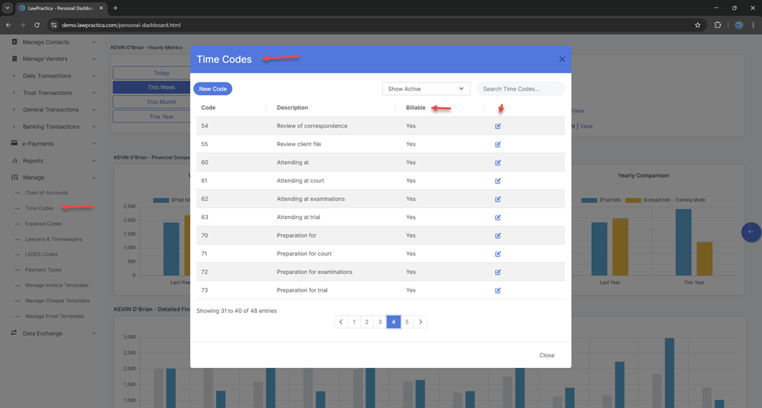 The Time Codes feature provides a structured, centralized way to manage all predefined billing activity codes used across LawPractica. With tools for viewing, creating, editing, and maintaining time code details, it ensures consistent time entry posting, accurate billing, and reliable reporting.