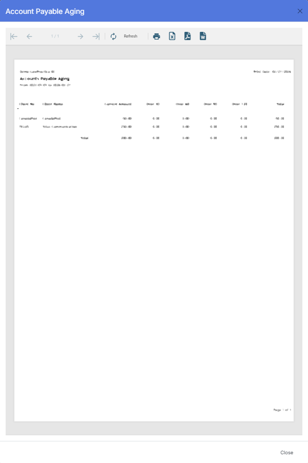The Accounts Payable Aging Report provides a clear breakdown of outstanding vendor payables by aging period. It supports financial oversight, cash‑flow planning, and compliance with internal accounting controls.
