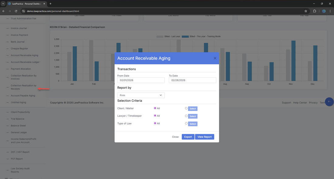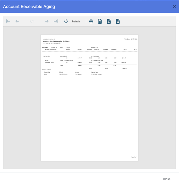 The Accounts Receivable Aging Report provides a comprehensive view of outstanding receivables by client and matter, broken down into aging periods. It supports financial oversight, collections management, and firm‑wide reporting.