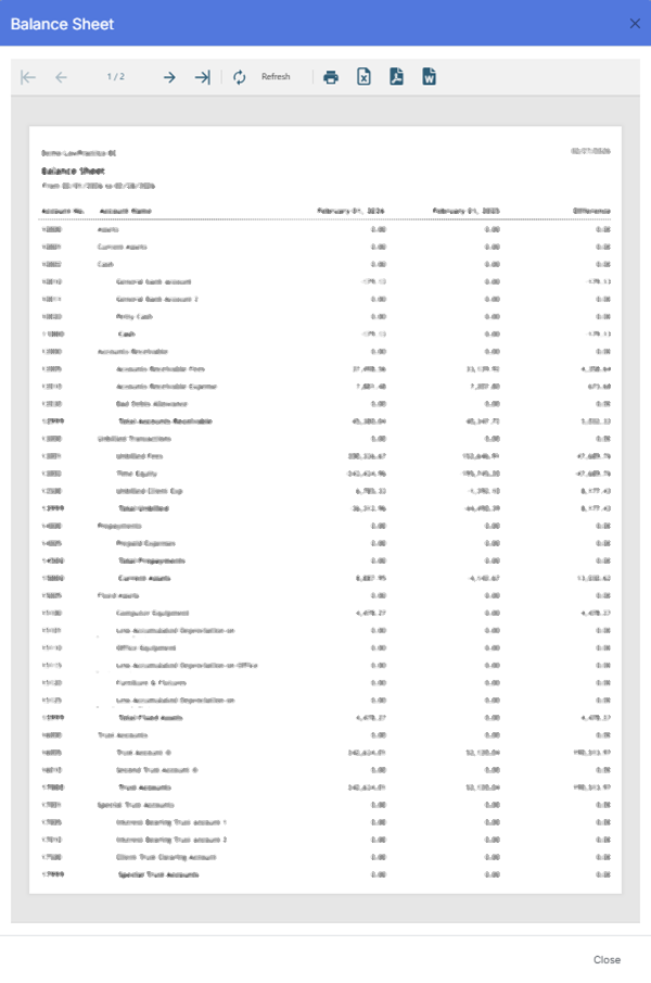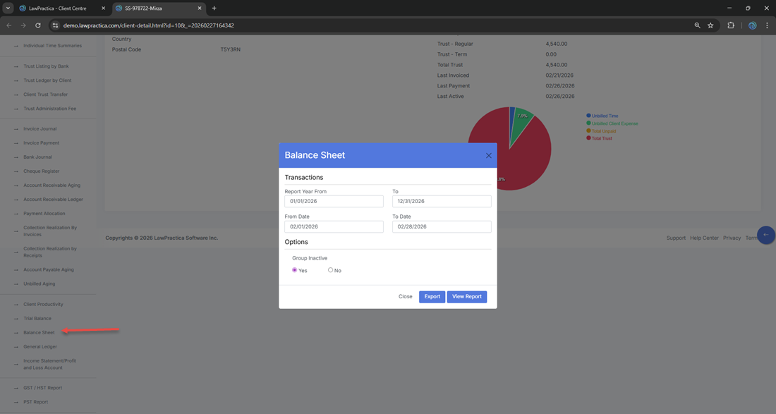The Balance Sheet Report provides a financial snapshot of the firm’s position at a specific point in time. It shows: