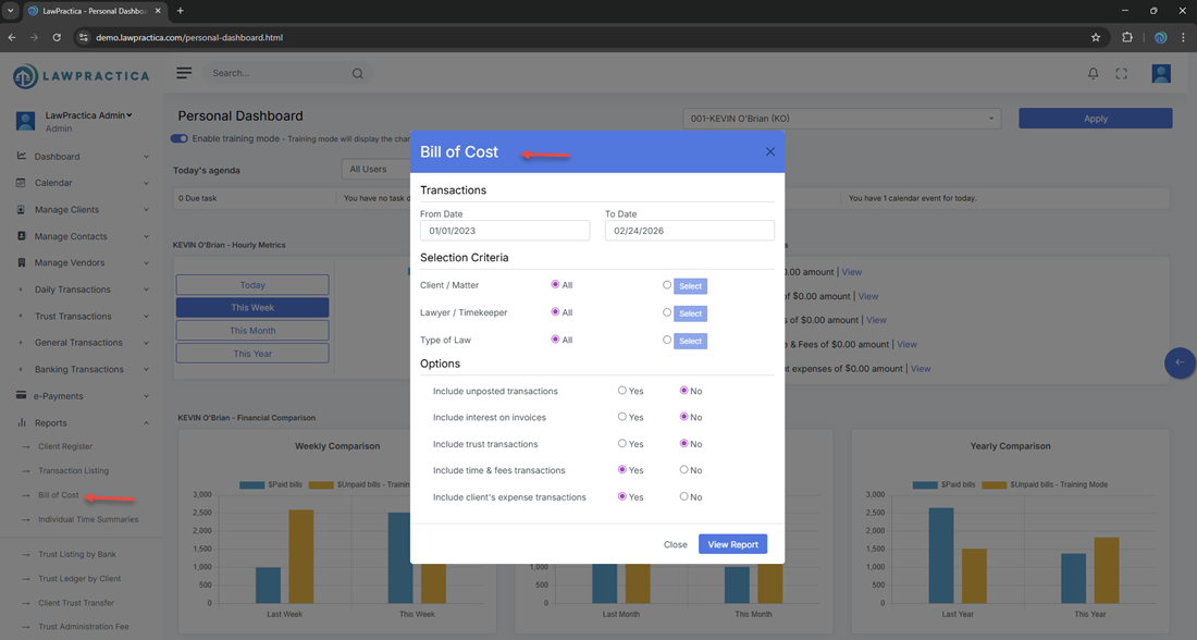 The Bill of Costs Report provides a detailed listing of all billable transactions within a selected date range, grouped by Client → Matter. It is commonly used for: