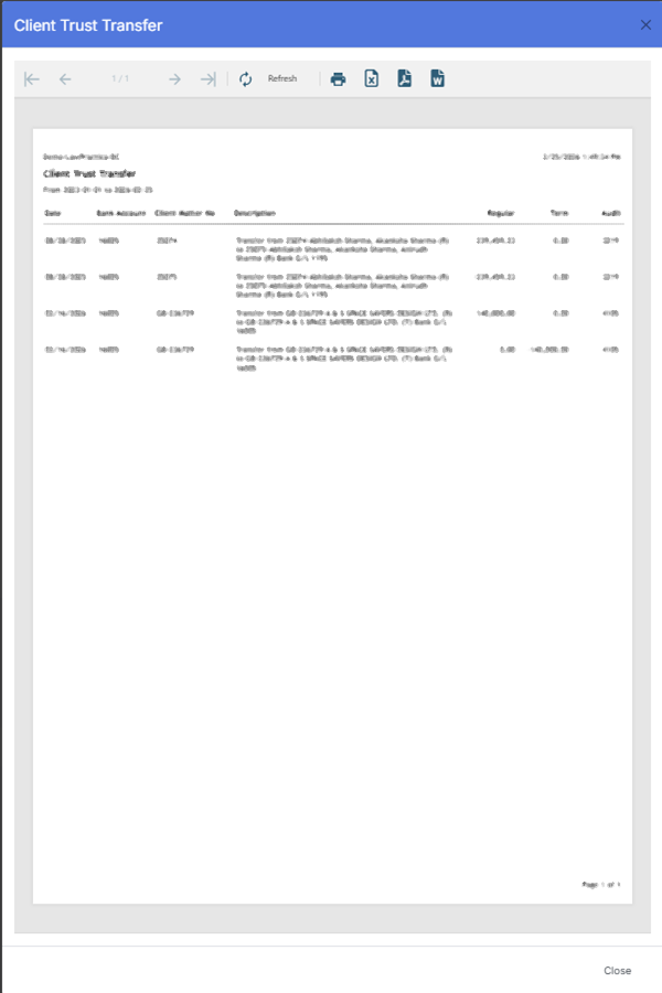 The Client Trust Transfer Report provides a clear, chronological listing of all trust transfers, including amounts, bank accounts, and audit details. It supports trust accounting compliance, reconciliation, and internal financial oversight.