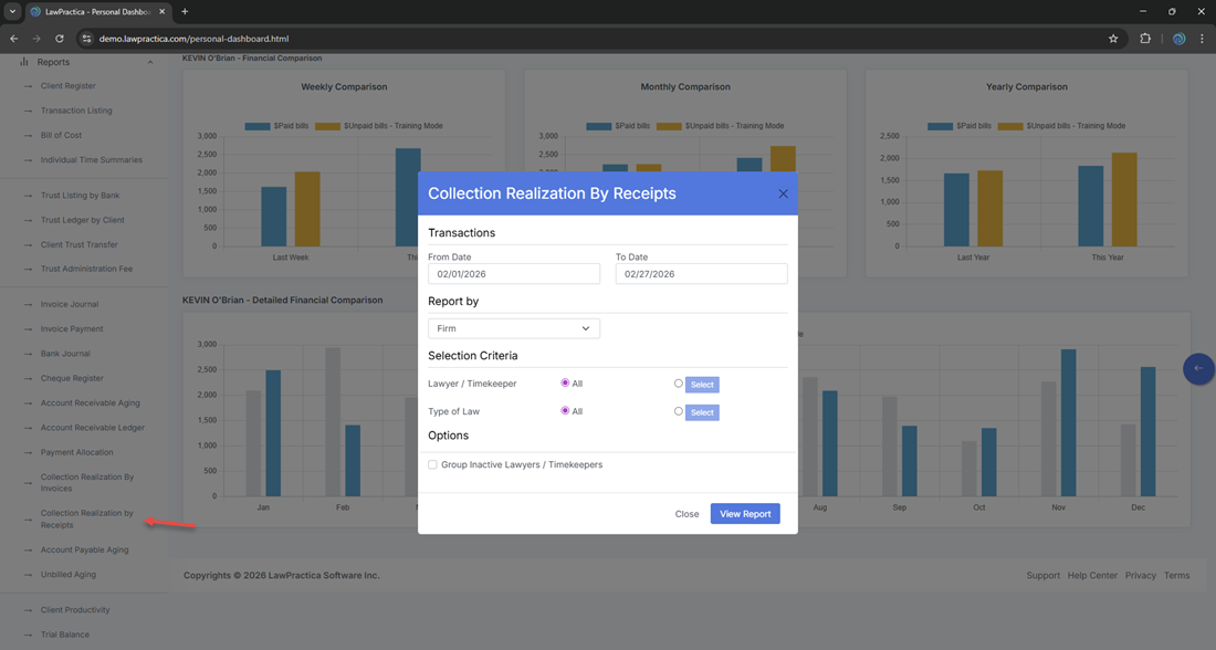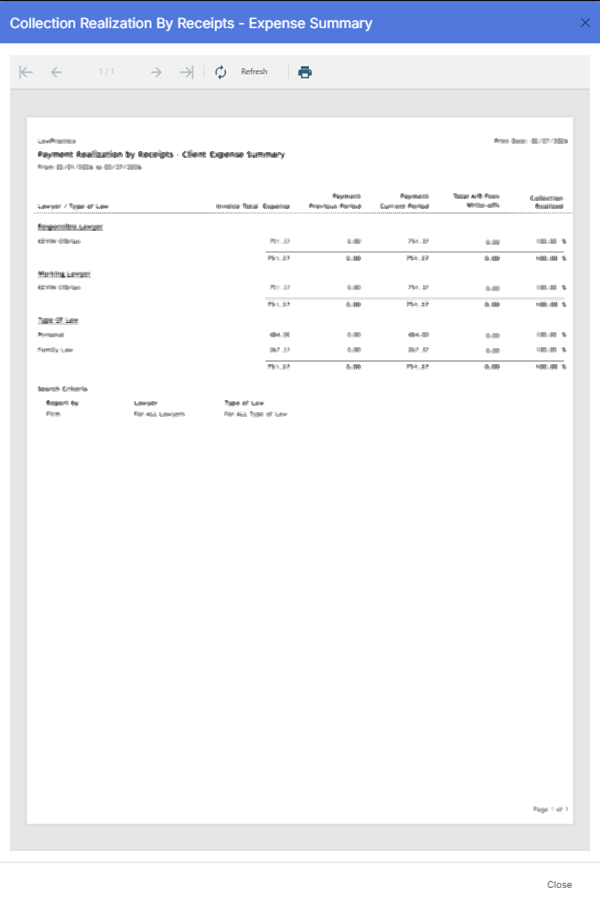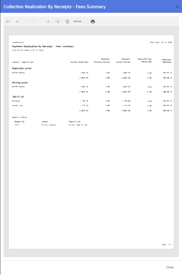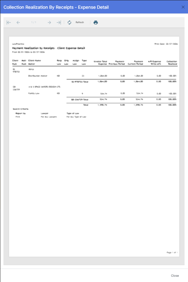The Collection Realization by Receipts Report provides a comprehensive analysis of how receipts translate into realized revenue across fees and expenses. With both summary and detailed views, it supports financial oversight, lawyer performance evaluation, and firm‑wide revenue management.