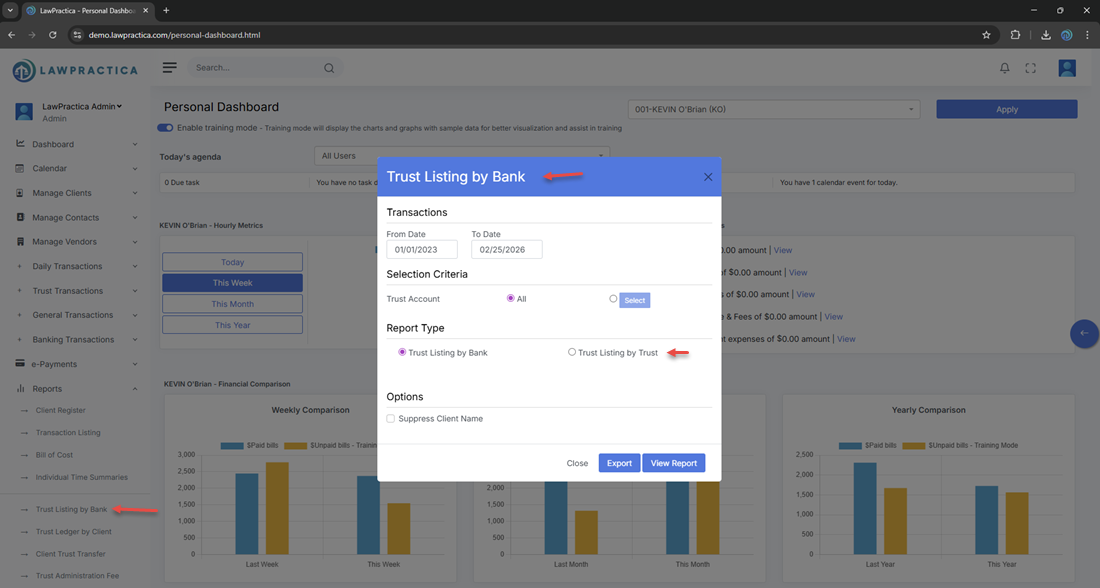 The Trust Listing by Bank Report provides a detailed, bank‑grouped view of all trust transactions, including balances, lawyer assignments, and transaction descriptions. It supports trust accounting compliance, reconciliation, and firm‑wide financial oversight.