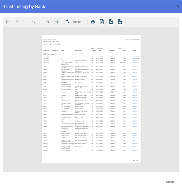 The Trust Listing by Bank Report provides a complete listing of trust transactions recorded across all trust bank accounts. It is used for: