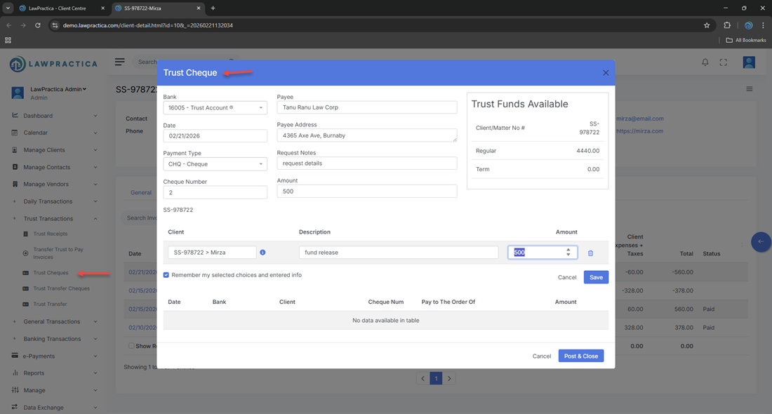 The Trust Cheque feature provides a secure, compliant method for withdrawing trust funds. With support for bank selection, trust type, payment type, TAF, and full audit trail tracking, it ensures accurate trust accounting and adherence to legal and regulatory requirements.