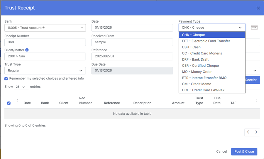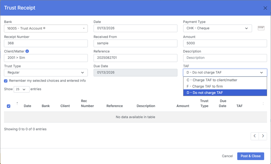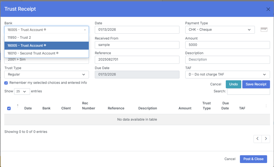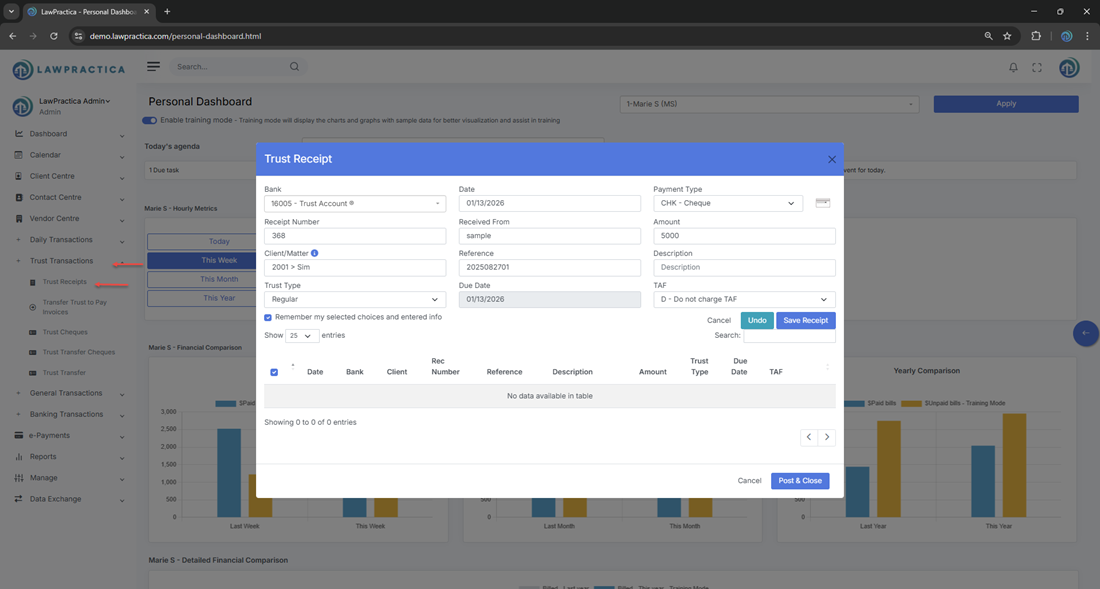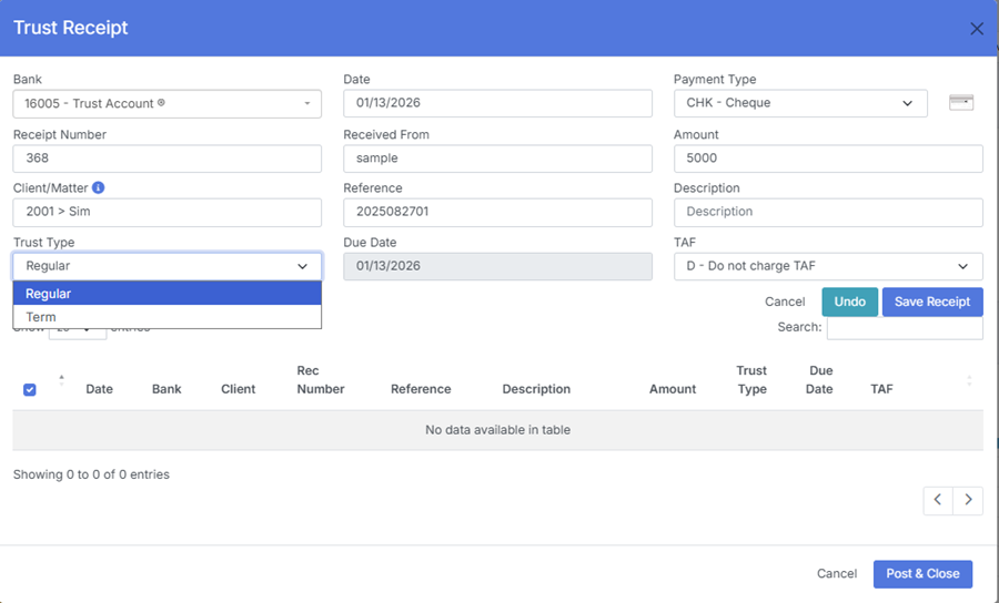 The Trust Receipt feature provides a structured, compliant method for recording trust deposits. With support for bank selection, trust type, payment type, and TAF, it ensures accurate trust accounting and full regulatory compliance across the firm.