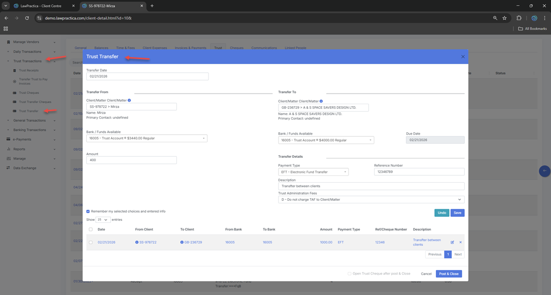 The Trust Transfer feature allows law firms to move trust funds from one client or matter to another within the trust account. This workflow is essential when: