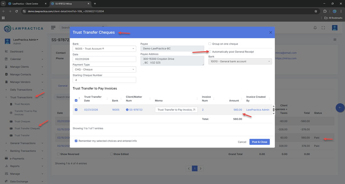 The Trust Transfer Cheque feature records the cheque created when trust funds are transferred from a client’s trust account to the firm’s general account to pay an invoice. Whenever a user posts a Trust Transfer – Pay Invoice transaction, the system automatically generates a corresponding Trust Transfer Cheque to document the withdrawal from trust.