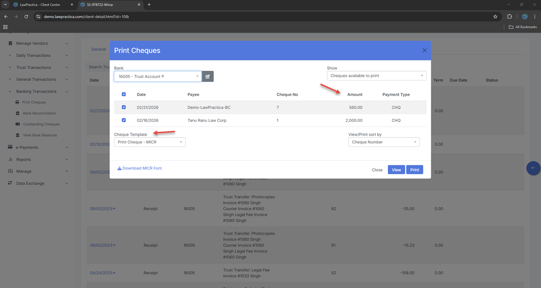 Trust Transactions → Trust Cheques