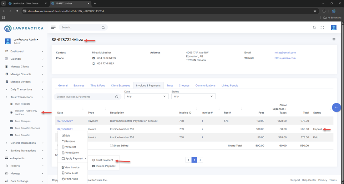 Client Centre → Client Details → Invoices & Payments → Pay Invoice from Trust