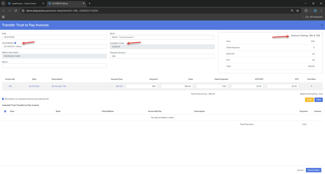 Users can select the trust bank, choose the invoice to pay, confirm available trust balance, and post the transfer in a single streamlined process.