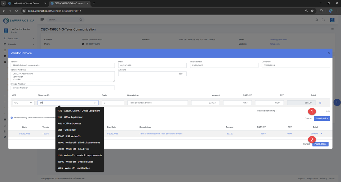 The Vendor Invoice interface is used to record vendor bills, allocate expenses or G/L charges, apply taxes, and post the invoice into the firm’s accounting system. It supports detailed line‑item entry, automatic tax calculation, and real‑time balance updates, ensuring accurate financial tracking and vendor management.