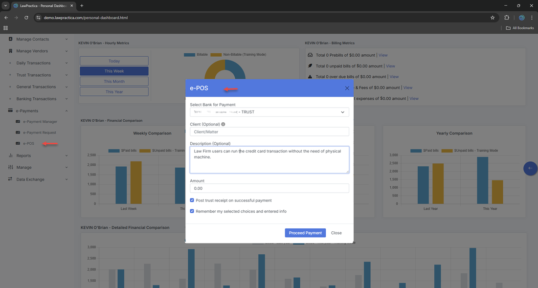 Once enabled, e‑POS becomes the firm’s digital equivalent of a physical payment terminal — but fully synchronized with LawPractica’s billing, trust, and general accounting workflows.