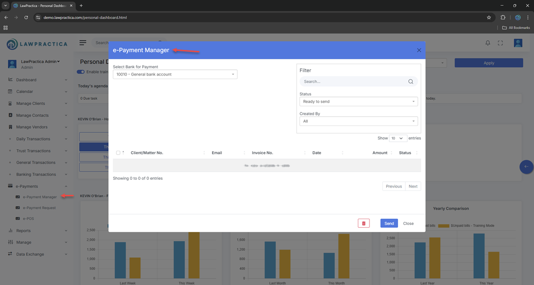 The e‑Payment Manager is only visible when LawPay is enabled.